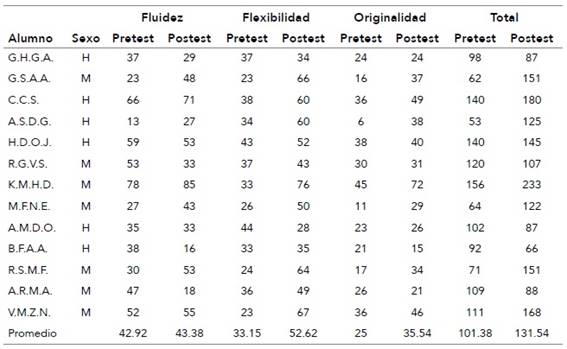 Para conocer si estas diferencias fueron significativas, se realizó una comparación de rangos Wilcoxon y se encontró que hubo diferencias significativas en los indicadores de originalidad (Z= -2.197, sig.= 0.028), elaboración (Z= -2.628, sig.= 0.009), fluidez (Z= -2.161, sig.= 0.021) y en el puntaje total (Z= -2.273, sig.= 0.023). Los datos mostraron que títulos (Z= -0.135, sig.= 0.893) y cierre (Z= -1.122, sig.= 0.262) no presentaron diferencias estadísticamente significativas.