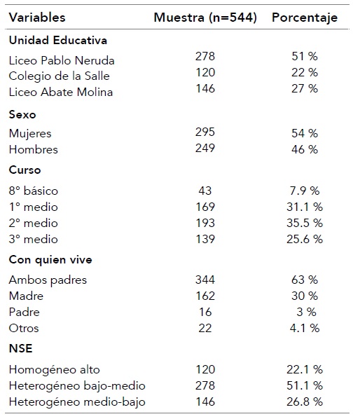 Los tres centros educativos seleccionados que accedieron a participar del estudio pertenecen a una zona urbana de la VII región de Chile. Participaron en este estudio un total de 544 jóvenes, con edades comprendidas entre los 13 y los 18 años (M=15.11, DT=1.052), todos ellos escolarizados en colegios científico-humanistas, cursando entre 8° básico y 3° medio. De estos, el 22.1 % pertenecían a un colegio particular, el 51.1 % a un colegio sub-vencionado y el 26.6 % a un colegio público. Las características sociodemográficas de la muestra se presentan en la tabla 1. Todos los participantes respondieron un cuestionario; 278 de ellos, en su modalidad en línea y 266 en formato impreso.