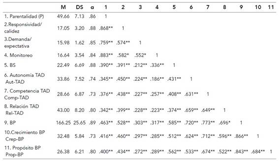 La tabla 2 muestra un análisis descriptivo de las variables del estudio, así como las correlaciones entre ellas. Se destacan altas correlaciones entre parentalidad y monitoreo (p=.001), entre P y responsividad/calidez (p =.001), así como entre Comp-TAD y BP (p = .001). Todas las alphas se encuentran sobre α= .73.