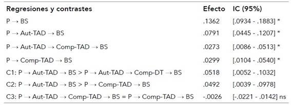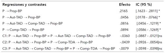 Para los análisis de mediación se utilizó el estadístico del modelo 6 de Process (Hayes, 2018). Se obtuvieron cuatro modelos de mediación. Estos corroboraron el efecto directo de la P en el BS (figura 1), además de los efectos indirectos de las regresiones (tabla 3) y los contrastes, entendiendo que la P es mediada por la Aut-TAD con un efecto en la comp-TAD, que impacta positivamente el BS adolescente.