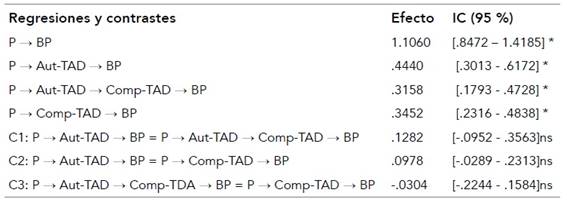 En el segundo modelo (P y BP), además del efecto directo (P → BP), observamos tres efectos indirectos (figura 2): 1) P → Aut-TAD → BP; 2) P → Aut-TAD → Comp-TAD → BP; y 3) P → Comp-TAD → BP. Como puede comprobarse en la tabla 4, todos estos efectos son significativos. En dicha tabla, el análisis de contrastes indica que ninguno de estos efectos es significativamente mayor que los demás.