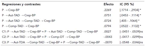 En el tercer modelo (P y Crep-BP), además del efecto directo (P → Crep-BP), observamos tres efectos indirectos (figura 3): 1) P → Aut-TAD → Crep-BP; 2) P → Aut-TAD → Comp-TAD → Crep-BP; y 3) P → Comp-TAD → Crep-BP. Como puede observarse en la tabla 4, todos estos efectos son significativos. El análisis de contrastes nos muestra que ninguno de estos efectos es significativamente mayor que los demás (tabla 5).