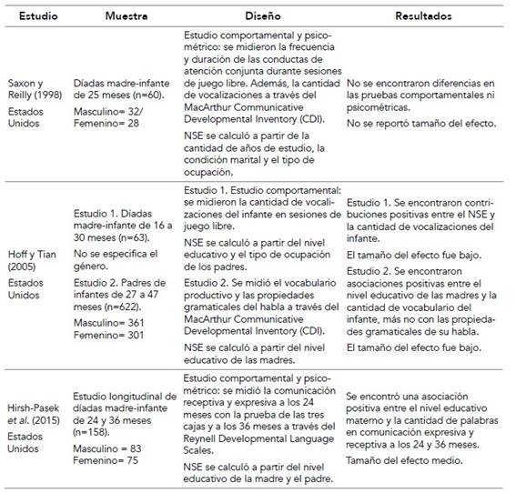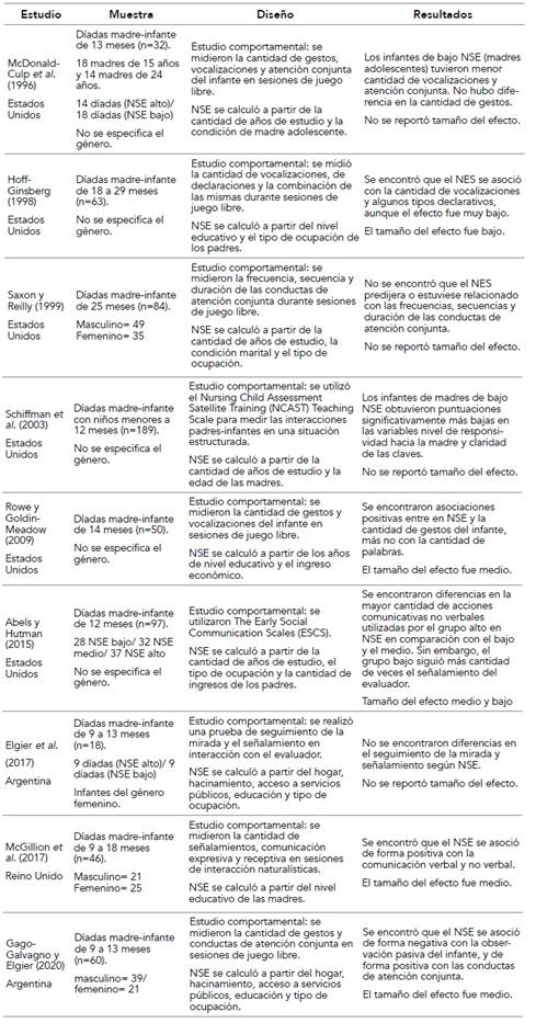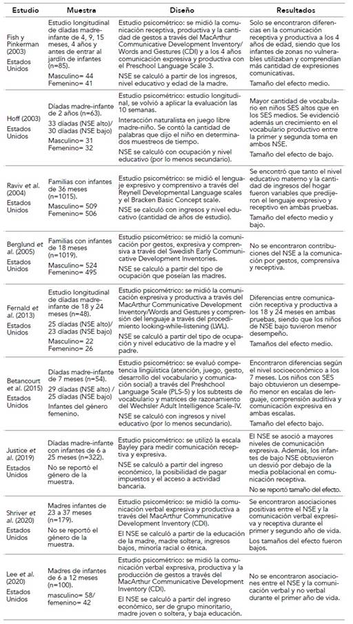 En las tablas 1, 2 y 3 se resumen los resultados principales de los estudios, que fueron listados por año y según el tipo de técnica de recolección de datos que utilizaron (psicométrico, comportamental y psicométrico y comportamental simultáneamente). En la primera columna se indicó el nombre de los autores, el año y el país de origen. En la segunda columna, el tipo de muestra utilizado, con la cantidad total y por género de la misma y el rango etario de los infantes. En la tercera columna, se detalló el tipo de instrumentos utilizados tanto para las variables de comunicación temprana verbal y no verbal como los indicadores de pobreza. Por último, se reportaron los principales resultados de cada estudio y el grado de tamaño del efecto.