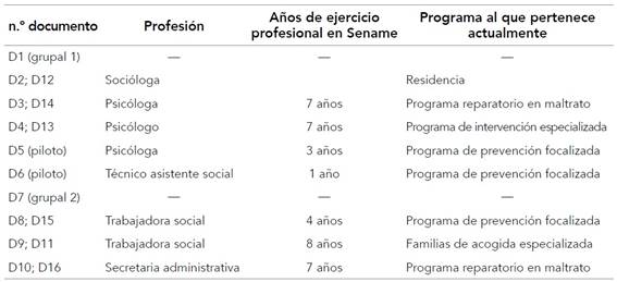 La etnografía digital tuvo una duración de tres meses (julio-septiembre 2020) y participaron cinco trabajadoras y un trabajador (tabla 1) pertenecientes a distintos organismos colaboradores acreditados por el Sename. El contacto con el trabajador y las trabajadoras se realizó mediante el Sindicato Interempresa Nacional de Trabajadores/as Subcontratados del Servicio Nacional de Menores. La selección de las personas participantes se realizó a través de un muestreo orientado por la información (Flyvbjerg, 2011), cuyos criterios de selección consideraron el tipo de programa (es decir, que fuesen programas de la línea ambulatoria de Sename) y la jerarquía de las personas trabajadoras (que no tuviesen cargos de jefatura). En relación con las características sociodemográficas de las personas seleccionadas, todas pertenecían a organizaciones no gubernamentales ubicadas en la región de Valparaíso, Chile. La edad promedio de ellas fue de 31 años y su tiempo de ejercicio profesional en la red Sename fluctuó entre los 1 y 8 años.