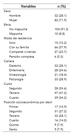 Se trabajó con una muestra no probabilística por conveniencia formada por 114 estudiantes de la Universidad de La Frontera matriculados en segundo, tercero o cuarto curso de algunas de las siguientes cuatro carreras: Derecho, Enfermería, Kinesiología y Psicología (tabla 1). Se seleccionaron cuatro carreras de facultades distintas con el objetivo de obtener una muestra diversa y lo más representativa posible del estudiantado de la Universidad de La Frontera.