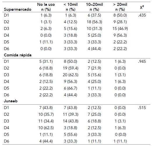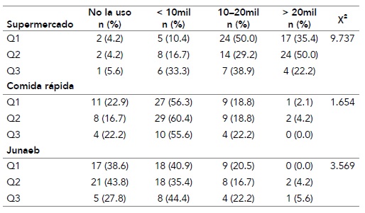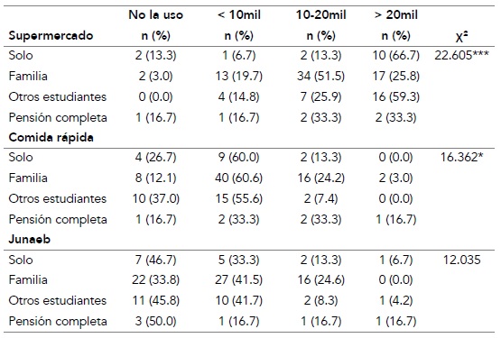 Una amplia mayoría de los estudiantes que viven solos o comparten residencia con otros estudiantes gastan más de $20 000 en supermercados al mes (χ² = 22.605; p = .007). Poco más de la mitad de los que viven con la familia gastan entre $10 000 y $20 000. Los que menos dinero emplean en el supermercado son aquellos que viven en pensión completa (tabla 3). En cambio, estos últimos son los que más gastan en locales de comida rápida. Quienes viven solos o comparten departamento presentan un gasto parecido en locales de comida rápida, el cual es notablemente inferior a quienes viven en pensión completa (tabla 3). La tabla 3 muestra que una amplia mayoría de los encuestados, sin importar el tipo de residencia, destina poco o ningún dinero de la tarjeta Baes a la adquisición del menú Junaeb.