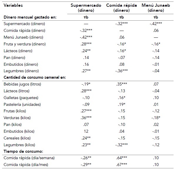 Gastar en el supermercado también correlaciona con la compra de mayor cantidad de frutas y verduras (p < .001), lácteos (p = .004) y legumbres (p = .001). Por otro lado, gastar en el supermercado correlaciona inversamente con la cantidad adquirida de bebidas y jugos (p = .030), gasto en comida rápida (p < .001), gasto en menú Junaeb (p < .001) y número de visitas a establecimientos de comida rápida por semana (p = .002) y por mes (p = .001). El perfil sociológico de la persona que más gasta en supermercados sería un estudiante de segundo curso, que vive solo o con otros estudiantes, y pertenece a los primeros deciles.