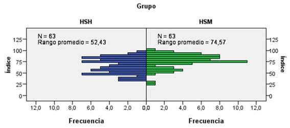 En la figura 1 se pueden observar niveles más altos en los HSM (Mdn= 77.27), frente a los HSH (Mdn= 65.91), ratificados con la prueba no paramétrica U de Mann-Whitney, en la que se encontraron diferencias significativas entre ambos grupos poblacionales (U= 2.68, p=.001). Por lo que se interpreta que las familias de los HSH presentan una deficiente capacidad de respuesta y adaptación a circunstancias que desafían la heteronormatividad.