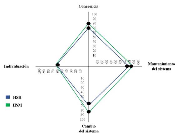 En lo que respecta a las dimensiones que conforman el proceso del MOS, se corrió la prueba estadística Kruskal-Wallis, cuyos resultados mostraron diferencias significativas en tres de las dimensiones teóricas: coherencia (X2= 6.20, p= .013), mantenimiento del sistema (X2=14.13, p= .001) y cambio del sistema (X2= 9.89, p= .002), a excepción de la dimensión restante, individuación, en la que no se encontraron valores significativos (X2= 2.06, p= .150), como se ilustra en la figura 2.