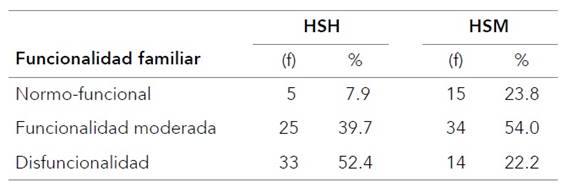 Al determinar las diferencias en los niveles de funcionalidad familiar, como se muestra en la tabla 1, se identificó que la muestra de HSH presenta un mayor porcentaje de disfuncionalidad familiar (52.4%) en comparación con el grupo de los HSM, en quienes preponderó un mayor porcentaje de funcionalidad familiar moderada (54.0%).