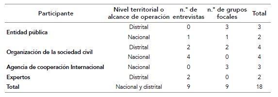 En total se realizaron nueve entrevistas y nueve grupos focales que involucraron entre dos y diez personas. En términos de participación por actores: cinco fueron entidades públicas (dos a nivel nacional) y once organizaciones de la sociedad civil (en adelante OSC) y agencias de cooperación internacional. Todos los contactos se realizaron de manera virtual, en forma de encuentros sincrónicos por las plataformas de Google Meet, Microsoft Teams y Zoom. Adicionalmente, se realizaron dos entrevistas a personas expertas en educación y migración, con quienes se discutieron algunos de los hallazgos de las entrevistas y grupos focales. La selección de los participantes se realizó por medio de la búsqueda de páginas web de instituciones públicas y organizaciones privadas con especial atención a población niñez migrante, a las que se enviaron cartas de invitación formal, junto al modelo de consentimiento informado. En los casos de respuesta positiva, se hicieron nuevos contactos por bola de nieve. En la tabla 1 se presenta la distribución de participantes en grupos focales y entrevistas.