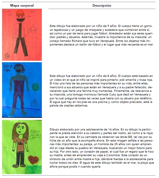 Adicionalmente, existe desarraigo y anhelo por su familia, especialmente de abuelos, como se observó en los mapas corporales elaborados por tres participantes (tabla 2).