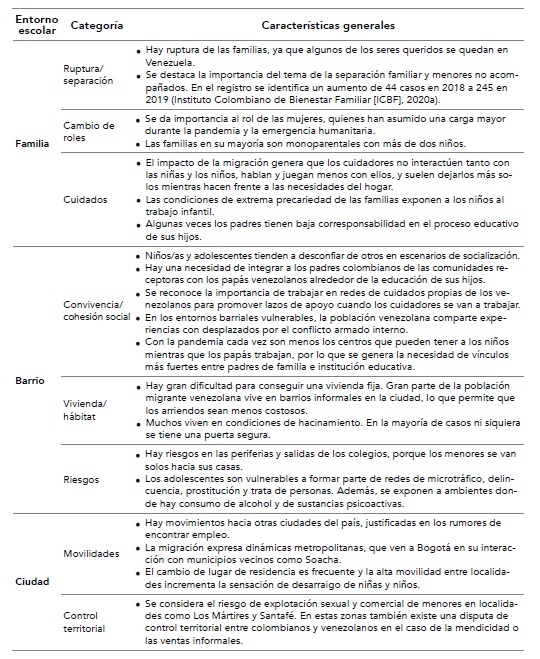 El entorno escolar de los estudiantes venezolanos abarca esferas amplias que van desde su familia, hasta su barrio y las movilidades en la ciudad. Además, hay casos de menores no acompañados, quienes enfrentan las mayores dificultades para obtener su bienestar básico en la migración, principalmente por la limitada capacidad de los agentes de protección pública para atender sus necesidades (Save the Children, 2019). Considerando el contexto anterior, la tabla 3 presenta los resultados frente a cómo las instituciones, las organizaciones y los expertos entrevistados caracterizan los entornos escolares de la familia, el barrio y la ciudad de acuerdo a diferentes categorías identificadas en las entrevistas y grupos focales.