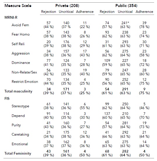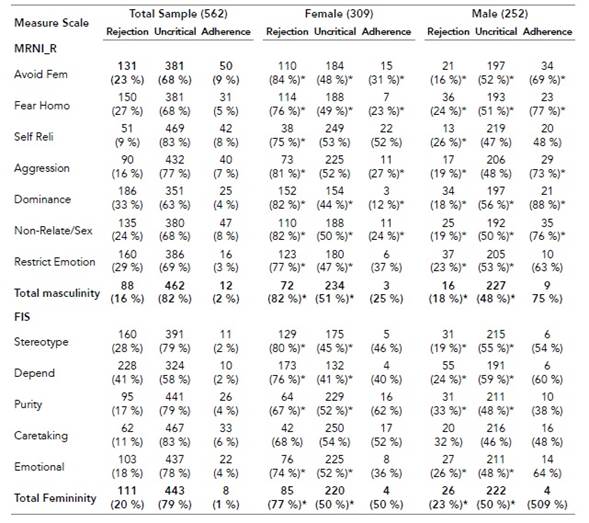 Demographic characteristics are presented as frequencies and percentages. The distribution of participants at different levels of attitudes towards the traditional ideologies was compared. For this purpose, the results of the MRNI-R and FIS scales were categorized as follows: average total scores between 1 and 2 were classified as «rejection»; average total scores between 2 and 4 were classified as «uncritical acceptance»; and, average total scores between 4 and 5 were classified as «adherence» to traditional ideologies. Both the MRNI-R and the FIS provided information on general trends -total scale- and on specific trends by subscales. The results indicated that the established trends in the total value of the scale were maintained in the subscales, so the analysis was performed based on the total values.
