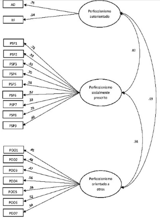 Finalmente, los índices de omega de McDonald, calculados a partir del modelo 3 sugieren una adecuada consistencia interna para las tres dimensiones, con valores de .78, .82 y .71 para perfeccionismo autorientado, socialmente prescrito y orientado a otros, respectivamente.