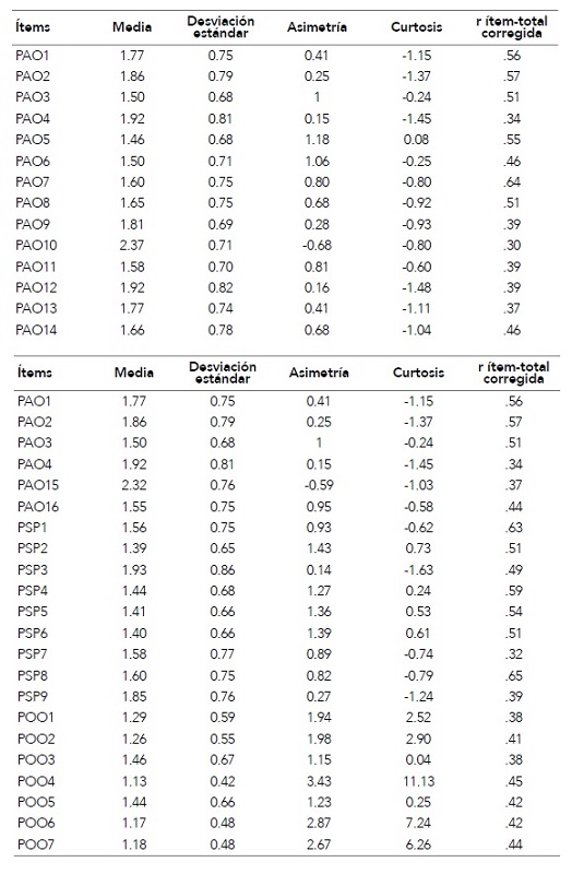En términos generales, los elementos presentan valores de asimetría y curtosis considerados aceptables, a excepción de cinco ítems correspondientes a la dimensión de perfeccionismo orientado a otros, los cuales evidencian una distribución leptocúrtica y con asimetría positiva. Por otra parte, todos los ítems alcanzaron o superaron el valor de .30 en las correlaciones ítem-total corregidas, lo cual denota un buen poder discriminativo.