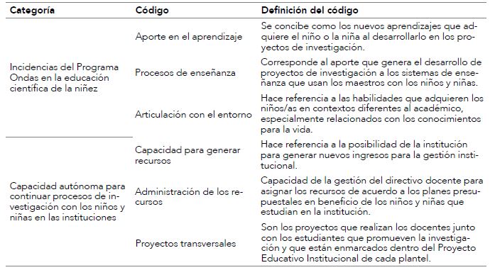 Antes de iniciar el componente metodológico, se establecieron las categorías de análisis -extraídas del marco referencial-, las cuales estuvieron presente en los instrumentos diseñados, validados y aplicados en las dos fases. Cada categoría se presenta en la tabla 3 con sus respectivos códigos. Se aclara que no hubo cambio alguno en su identificación y análisis luego del desarrollo del trabajo de campo.