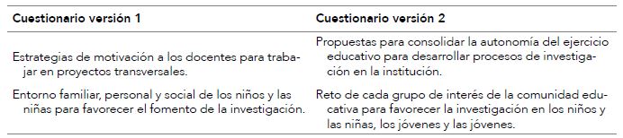 Ahora, es necesario clarificar algunos aspectos que surgieron en las respuestas dadas por los participantes en la primera parte del método. Se hace referencia a las opciones para consolidar la autonomía del ejercicio educativo para desarrollar procesos de investigación en la institución y los desafíos de cada grupo de interés de la comunidad educativa para favorecer la investigación en los niños y las niñas, los jóvenes y las jóvenes.