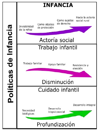 En efecto, las tareas que el niño/a rural realiza en el ámbito económico, representan una alternativa para la sobrevivencia familiar y constituyen en simultáneo una resistencia a la lógica capitalista, la cual busca involucrar a las personas desde temprana edad en procesos de rendimiento productivo y de consumo. Por el contrario, en la AFC, el/la niño/a toma parte de procesos económicos que buscan el autosustento y la reproducción familiar y que, en la percepción del mundo adulto, a la vez representan procesos educativos y otorgan condiciones de elección. De esta manera, la relación entre infancia, trabajo y cuidado en las familias estudiadas implica un conflicto multidireccional entre las políticas económicas, educativas y sociales y las prácticas de trabajo y cuidado en el sector agrícola (OCDE, 2015).