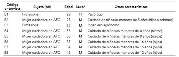 La estrategia muestral fue de carácter no probabilístico por conveniencia y bola de nieve, buscando actores clave para la generación del conocimiento que respondiera a la pregunta de investigación (Martínez-Salgado, 2012). En la tabla 1 se presenta la descripción de la muestra. En total fueron 6 mujeres cuidadoras y 2 profesionales. En cuanto a los criterios de inclusión en el caso de las primeras fueron: 1) dedicarse a la AFC, es decir, vivir mayormente de su trabajo en el predio para el autosustento o la venta de excedentes; y, 2) ser cuidadora principal de niños/as menores de 18 años, aunque idealmente menores de 12, porque en esta etapa requieren de más cuidados. Para el caso de los funcionarios/ as, solo se estableció un criterio: desempeñarse en el ámbito técnico de programas orientados al desarrollo social y la atención infantil en medios rurales. Cada participante firmó un consentimiento informado acorde a la normativa establecida por el comité de ética de investigación de la universidad donde se alojó el estudio.