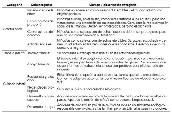 Para el análisis se siguió el procedimiento de teoría fundamentada, de acuerdo con el cual se codificó en modalidad abierta, axial y selectiva la información, mediante la comparación constante de los datos entre sí y, en la última fase, con los antecedentes teóricos (Charmaz, 2006; Hernández et al., 2010). Para dar mayor densidad a la descripción de los resultados, se elaboraron memos a lo largo del proceso de estudio (Charmaz, 2006). Se utilizó el programa Dedoose para el análisis de información. Las subcategorías se agruparon en tres grandes categorías y se ordenaron según su gradualidad, de menor a mayor, en cuanto a sus propiedades: actoría social, trabajo y cuidado infantil. En la tabla 2 se presentan categorías y subcategorías, así como memos asociados a cada una.