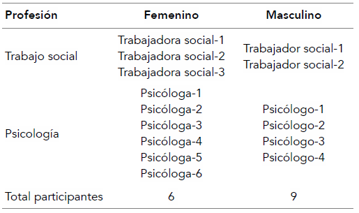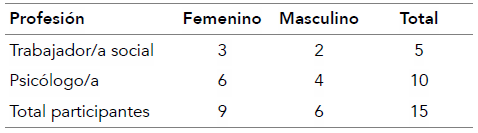 Tras la utilización de la técnica de bola de nieve, se contactó a un participante, luego a otro y así sucesivamente. De esta forma se convocó a quince profesionales: diez del área de psicología y cinco de trabajo social de diferentes programas ambulatorios de las siguientes comunas de la Región Metropolitana: Lo Espejo, La Pintana, Santiago, Recoleta, San Miguel, Pedro Aguirre Cerda, Renca y Cerro Navia (tabla 1).
