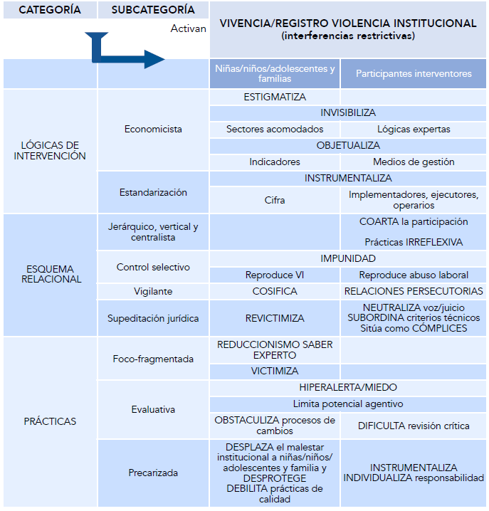 La violencia institucional aquí revisada se expresa a través de programas o procedimientos (Martínez & Sánchez, como son citados en Salamanca, 2018). Opera a partir de un entramado complejo (La Parra & Tortosa, 2003; Vitale et al., 2015) que se aloja en el campo de la gestión-intervención del sistema de protección y está conformada por las categorías descritas, así como por las vivencias o registros de violencia y los efectos que estas implican: exclusión, restricción de la agencia, objetualización, victimización, debilitamiento, entre otros. La violencia institucional presenta una expresión visible, como señalan los informes sobre violencia en centros residenciales, pero también otra invisible, que se desprende de las operaciones ritualizadas, rutinizadas, no intencionales (Ginga & Campana, 2018) e indirectas (Ávila et al., 2020) que se dan a partir de este complejo entramado de racionalidades, relaciones, prácticas, vivencias y efectos. Por tanto, la violencia institucional puede ser entendida como una cadena de violencias que se narra como un continuo en el que los miembros de los equipos profesionales de la red de protección se vuelven testigos de la violencia institucional (victimizaciones o revictimizaciones) hacia niñas, niños y adolescentes y, a la vez, sujetos de esta; y donde las niñeces, juventudes y sus familias se encuentran en el último eslabón.