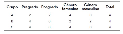 La investigación consistió en el análisis de los relatos escritos y orales de los individuos jóvenes, el cual realizamos a partir de los principios de la teoría fundamentada constructivista. Obtuvimos estos datos gracias a la aplicación de tres grupos de discusión, conformados por 10 estudiantes de pregrado y dos de posgrado (tabla 1), quienes acudieron voluntariamente a la convocatoria realizada por correo electrónico.