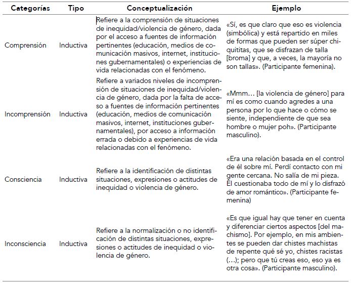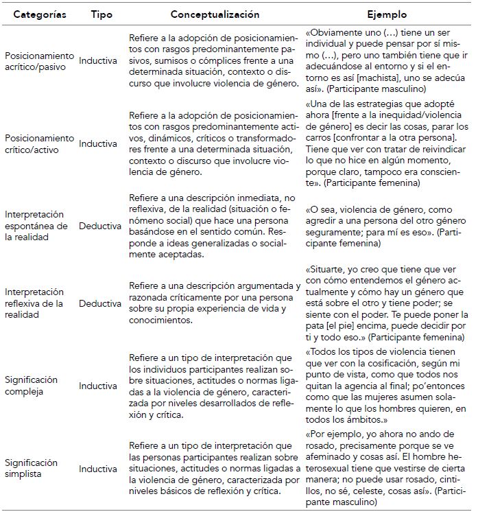 Tras el análisis de los grupos de discusión, observamos que las interpretaciones que las personas jóvenes hacen de la violencia y la inequidad de género están influenciadas por varios factores externos e internos, normalmente entrelazados. Estos derivan en variadas categorías de análisis, asociadas a diferentes estados de comprensión, de consciencia, de significación, de interpretación y de posicionamientos respecto a la violencia de género (tabla 2).