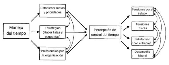 Desde la psicología, el estudio sobre la gestión del tiempo comenzó a cobrar relevancia hace más de 50 años en el ámbito laboral (Drucker, 1967; Lakein, 1973; Mackenzie, 1972); sin embargo, en 1994 Macan desarrolló un modelo que explicaba el proceso de la gestión del tiempo. Dicha propuesta presentaba el establecimiento de metas y la priorización, comportamientos específicos (crear listas de chequeo o esquemas) y tener preferencia por la organización, como estrategias que beneficiaban a los individuos solo si se percibía control sobre el uso del tiempo. A su vez, la combinación de las estrategias y la percepción de control permitía tener los resultados esperados respecto de las tareas planeadas, además de disminuir las tensiones generadas por el trabajo no resuelto (figura 1).