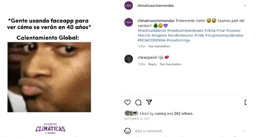 En el caso de su iniciativa ClimaticasxTremendas, realizó la primera entrada de la Academia Climáticas expresando con claridad su intención de sensibilizar con la temática ambiental como alternativa diferenciadora de generaciones anteriores para poder tener futuro. Las publicaciones informativas de este perfil se caracterizan por ofrecer datos, argumentos o ideas sustentadas científicamente y con un matiz pedagógico, explicando de forma sencilla las problemáticas sobre las cuales quieren discutir y ofreciendo recomendaciones. Una diferencia con respecto a las otras dos organizaciones es que ocupan con frecuencia el recurso de la risa y la ironía mediante memes para dar cuenta de las consecuencias del cambio climático (figuras 10a y 10b), al estilo de lo que señala Figueroa- Grenett (2018) sobre la posibilidad de apertura a lo imaginario que genera la articulación de elementos lúdicos y festivos en el accionar político juvenil.