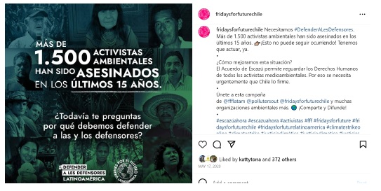 Viernes por el Futuro produce contenidos propios (imágenes y audiovisuales aparecen con créditos) con el propósito de sensibilizar y ofrecer información sobre su causa y el objetivo de sus manifestaciones sistemáticas cada viernes. Sus publicaciones se caracterizan por apelar a las emociones e interpelar a su público con varias interrogantes, generando preocupación y movilizando para la acción a través de múltiples convocatorias (figuras 9a y 9b). Esto se articula en publicaciones recurrentes bajo la sección «Sabías qué», con información de interés sobre el futuro para invitar a actuar en el presente o bajo la etiqueta #DefenderALesDefensores, que entrega datos sobre ambientalistas asesinados.