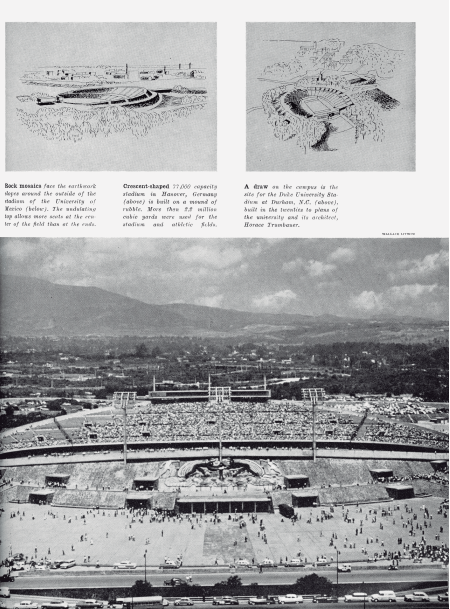 Al igual que los frontones, el acercamiento al estadio olímpico siempre mantuvo un vínculo importante con su entorno. Si antes ya se comentó que la experiencia mexicana en el movimiento de grandes volúmenes de tierra determinó formal y estructuralmente el recinto, la reducción de costos que implicaba mover la tierra en terraplenes y plataformas a escala pública en las ciudades podía estar inspirando un nuevo aspecto de la arquitectura moderna. Así lo destacó un análisis dedicado al tema publicado en Architectural Forum en agosto de 1960, en el que una fotografía del estadio olímpico en pleno uso acompañó los dibujos de dos proyectos semejantes en Alemania y Estados Unidos (Figura 10).39 No deja de ser interesante que el texto reseñó antecedentes tanto occidentales como prehispánicos para esta arquitectura terrestre ―algunas fortificaciones renacentistas holandesas o las construcciones incas― en las que se hacía consciente la forma que la propia tierra movida creaba en el entorno, formal y funcionalmente.