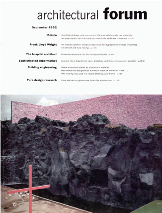 En 1952, el VIII Congreso Panamericano de Arquitectos fue el marco para la inauguración oficial de la Ciudad Universitaria. Es notoria y justificada la concentración de noticias y números especiales dedicados al tema, tanto en México como en el extranjero.15 En Francia, Techniques et Architecture publicó la obra en julio,16 en Estados Unidos, Arts & Architecture (A&A) en agosto17 y Architectural Forum (AF) en septiembre.18 De las estadounidenses, cabe mencionar que tanto A&A como AF dedicaron su portada al tema. La primera, con una fotografía de la cubierta de los laboratorios de la escuela de Ingeniería (Figura 1), mientras que la segunda optó por una foto de detalle del Pedregal de San Ángel (Figura 2), importante por la clara intención en mostrar los materiales tradicionales de construcción, como la piedra volcánica y el muro de mampostería aplanado y pintado de color rosa intenso.19