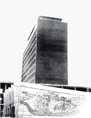 Dentro del primer medio enunciado, cabe recordar el impacto que tuvo la combinación de materiales tradicionales, colores y formas modernas de la Biblioteca Central y cómo ésta se convirtió, rápidamente, en un referente visual del conjunto universitario. En este contexto se anota el artículo que publicó Architectural Forum en julio de 195433 sobre el empleo de la piedra en las construcciones modernas, que abría el debate sobre la utilización de uno de los materiales más antiguos de edificación aplicado a las creaciones contemporáneas. Éste se ilustró con una fotografía de la recién inaugurada biblioteca universitaria. Al año siguiente, en noviembre de 1955, la misma publicación destacó el uso del color como elemento fundamental del diseño arquitectónico, y volvió a utilizar la imagen de la biblioteca, cuyos mosaicos de vibrantes colores mantenían actualizados los mitos fundacionales de la nación mexicana (Figura 9).34 La presencia de la Biblioteca Central se mantuvo vigente en las publicaciones periódicas todavía a mediados de la década de 1960, cuando Arts & Architecture publicó, en febrero de 1964, un artículo dedicado a los mosaicos de Juan O’Gorman.35