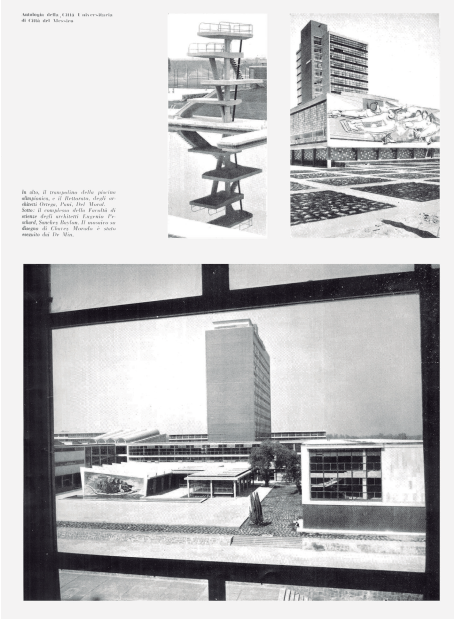 Ponti entendía la Ciudad Universitaria como la composición de elementos diversos, y, de igual forma, su análisis del conjunto fue un recorrido versátil sobre edificios aislados. El editor señalaba la transparencia espacial de la facultad de Medicina, el complejo de servicios de la alberca y la plataforma de clavados, la facultad de Ciencias o la Rectoría. Sin embargo, en donde el editor realizaría una pausa sería en la Biblioteca Central, el edificio que definitivamente se convertiría ―a su juicio― en el emblema de la universidad. La arquitectura, como todo arte, debía causar emociones y, en este caso, la percepción del enorme volumen que disuelve su masa en ligereza se volvía atmosférico y se transformaba con la gama de colores de los murales que lo cubren, evocando un lenguaje mexicano antiguo muy potente. El milanés terminaba su personal recorrido con la ineludible mención a los frontones que recordaban los paisajes prehispánicos.