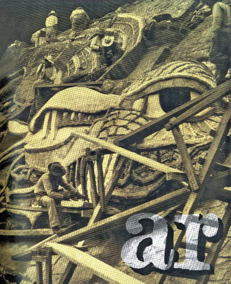 Por todo lo anterior, ya no sorprende que el perfil de un ojo gigantesco observe desde la mitología prehispánica, enlazando tradición y modernidad. Si bien los lectores habituales de la londinense AR debían estar acostumbrados al uso innovador de sus imágenes de portada, como lo era, por ejemplo, las frecuentes abstracciones fotográficas, los detalles descontextualizados de edificios y un diseño gráfico de vanguardia, se intuye el impacto que ese ojo monumental suscitó entre los suscriptores. Bajo la lengua bífida de la serpiente emplumada, un trabajador ―sentado en un andamio de madera elaborado in situ― realizaba la faena diaria de recubrimiento de los muros de piedra volcánica (Figura 5).