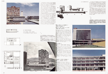 Una primera noticia sobre la construcción de la Ciudad Universitaria de Ciudad de México se encuentra en L’Architecture d’Aujourd’hui (AA) en 1951,13 en un número dedicado a nuevas construcciones escolares. Así, entre ejemplos europeos y americanos,14 los avances en las obras universitarias veían la luz en la revista francesa. Una primera página exhibía el dibujo de la planta de conjunto, que difería todavía de su resultado final, pero que ya mostraba la disposición general de los principales edificios. La torre de la Rectoría ―de Mario Pani, Enrique del Moral y Salvador Ortega― con lugar destacado en el proyecto urbano, lo tuvo también en el artículo de AA, pues se publicaron plantas, cortes, perspectivas y una descripción detallada de su programa arquitectónico.