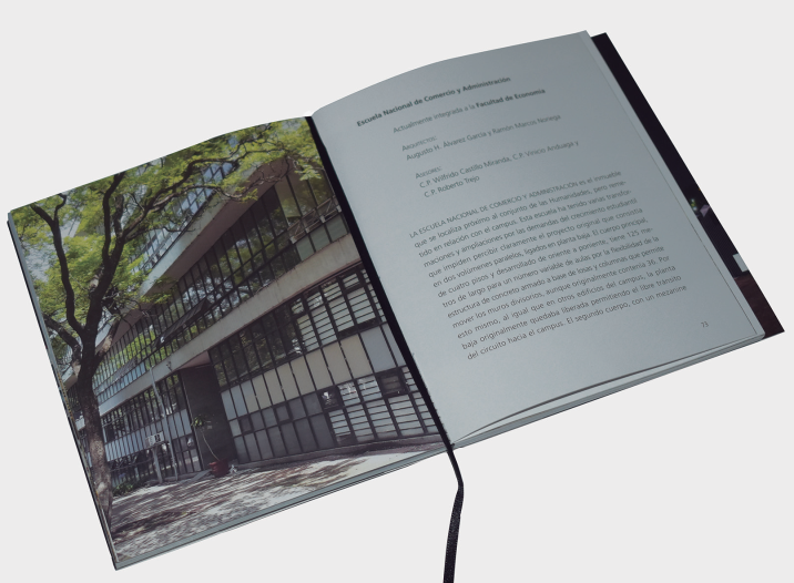 Las “fichas de edificios y campos deportivos” son el alma de esta amena publicación. Se presenta una ficha individual para cada uno de los inmuebles, en la que se hace una descripción de su forma, volumetría, alturas y su relación con el campus; porque a pesar de haber sido diseñados por diferentes grupos de arquitectos están vinculados gracias al uso magistral de los espacios abiertos y al plan maestro del conjunto.