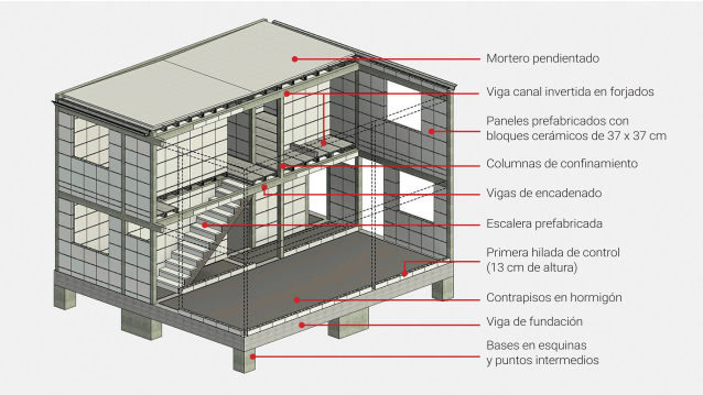 El elemento básico de la propuesta era un sistema de paneles prefabricados a partir de cinco ladrillos huecos de perforación vertical, elaborados en gres24 (de 37 x 37 cm) por un fabricante local, que quedaban a cara vista y servían como piezas de control dimensional en planta y en altura, los cuales eran armados previamente sobre formaletas metálicas. Para la pega de los ladrillos se usó un mortero situado en toda la superficie de contacto entre ellos, reforzando los dos bordes longitudinales de cada panel mediante sendos pares de barras de acero de 1/4” de diámetro.