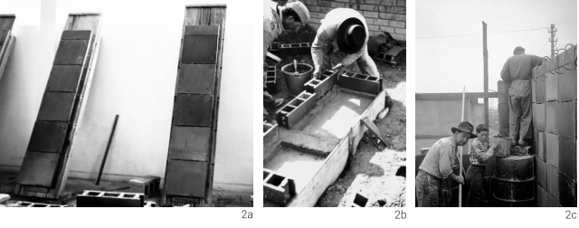 Una vez trasladados al sitio en donde se levantaba el prototipo, los paneles se posicionaban sobre los vértices del marco de cimentación construido previamente, así como en algunos puntos intermedios (con zonas más anchas a manera de zapatas de esquina y zapatas medianeras, respectivamente), para después situar entre ellos una primera hilada de ladrillos, también de gres, de 37 cm de largo y 13 cm de altura. De esta manera se verificaba la coordinación modular con todas las piezas constitutivas de los muros, considerando los vanos propios de puertas y ventanas. Por último, se encofraban y hormigonaban las columnas de confinamiento situadas en las conexiones entre los paneles, aprovechando la forma geométrica de sus bordes, y se fundía una viga de encadenado (o “de amarre”) sobre la cual se apoyaban las vigas que conformaban el forjado (Figura 2).