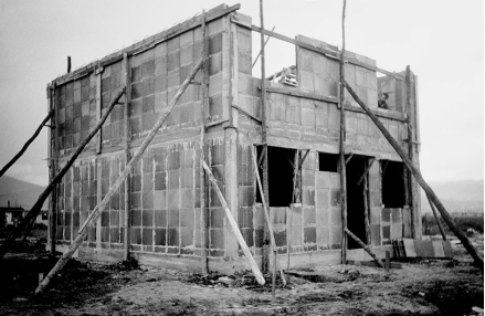 En una segunda fase, la casa experimental se construyó de manera íntegra en el patio a cielo abierto del Centro: inicialmente se hizo el replanteo y se levantó la cimentación mediante vigas prefabricadas de hormigón pretensado con sección en forma de U, con zapatas en las esquinas y las áreas bajo la intersección de muros. Sobre estos últimos, hechos enteramente con bloques de hormigón, se construyó la cubierta plana mediante vigas también prefabricadas en forma de T invertida, entre las cuales se situaron casetones aligerados de hormigón.