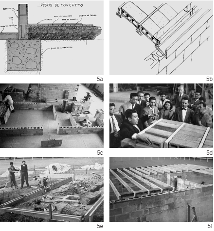 Para cada uno de los elementos constitutivos de la vivienda (cimientos, pisos, muros, vanos, cubiertas, instalaciones, equipo y mobiliario, acabados y pinturas) se estudiaron diferentes alternativas mediante dibujos tridimensionales hechos a mano alzada. De cada solución escogida se hizo un modelo a escala natural con materiales auténticos, que en conjunto conformaron un primer prototipo construido en los talleres del CINVA, en el cual los prefabricados de hormigón quedaban sueltos, sin mortero ni conexiones en ninguna de sus juntas, para que así los estudiantes los acomodaran libremente hasta alcanzar las dimensiones óptimas de los espacios con atención al tamaño de los materiales y componentes (Figura 5).