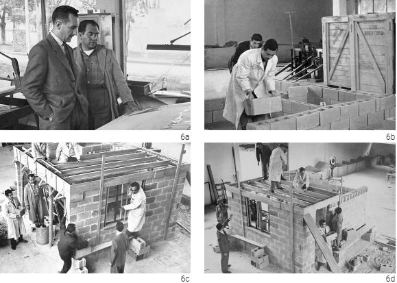 Lo anterior ayuda a comprender las razones que llevaron al cinva en diciembre de 1953 a dar comienzo a un programa de investigación sobre tierra estabilizada32 para la fabricación de bloques y baldosas para pisos, que una vez más quedó en manos de Eyhéralde;33 en los años siguientes se sumarían a él su compatriota Raúl Ramírez y los estadounidenses Donald H. McNeal y Robert L. Davison. Sin embargo, no se trataba de una idea novedosa: sugerida la investigación por el mismo Howard Fisher en las recomendaciones que hiciera para el futuro del Centro,34 bloques elaborados con tierra estabilizada mediante adiciones de cal o cemento ya venían empleándose con éxito en procesos de construcción de vivienda de bajo costo lideradas por Alfred Alcok en naciones africanas.35