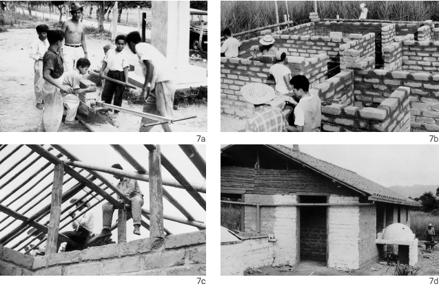 Fue por ello que en 1956 se construyó una vivienda experimental a partir de bloques de “suelo-cemento”, ya no en los talleres del CINVA sino directamente en el seno de una comunidad rural del municipio colombiano de San Jerónimo38 bajo la supervisión de Ernesto Vautier. Sin embargo, aquí los bloques se compactaron con pisones manuales gracias a la participación de mano de obra local, levantando una edificación de 75 m2 con un costo total de USD 6.09 m2. Una vez que se pudo contar con un prototipo preliminar de la máquina CINVA-RAM un año más tarde, el mismo Vautier asumió la dirección de un plan de entrenamiento en vivienda rural en la población de Chambimbal (Valle del Cauca), donde contó con la asesoría de la trabajadora social brasilera Josephina Albano y el sociólogo colombiano Orlando Fals Borda (Figura 7).