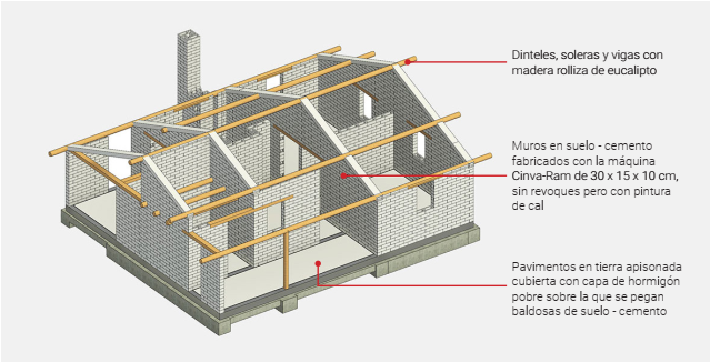 En el diseño de la vivienda había participado la propia comunidad, con el acompañamiento del personal del CINVA, la cual constaba de dos dormitorios, un salón de estar junto a la cocina, y de manera independiente un área para el lavado de la ropa, el baño y un depósito. La pendiente de la cubierta permitía alojar un tanque elevado de agua y, eventualmente, disponer de un dormitorio auxiliar a manera de altillo. En el proceso llevado a cabo, especial atención se tuvo en el diseño de la cocina y la unidad sanitaria, como muestra del interés por mejorar las condiciones higiénicas de la población campesina del país.