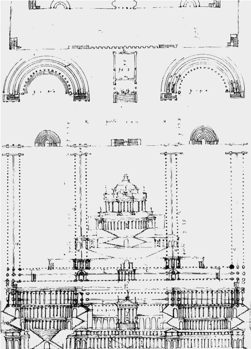 Es por ello que, a través de esta asociación de ideas y partiendo del proceso del disegno, Palladio escribió en I Quattro librique estudió sistemáticamente los fragmentos de las ruinas de los monumentos romanos por medio no sólo de los levantamientos in situ de los restos de estas estructuras que implican el conocimiento de la naturaleza, sino también interpretó sus principios y proporciones de estas bellas invenciones mediante los dibujos de la planta, el alzado y la sección en proyección ortogonal.24