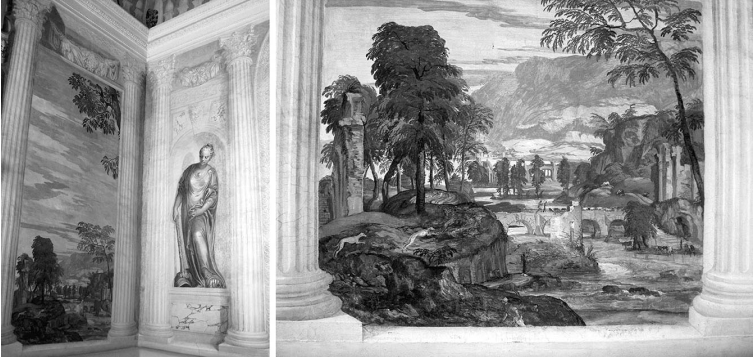 Los paisajes de Veronese destacan al estar delimitados en función y proporción del sistema de las columnas de mármol que subdividen las paredes, articulándose con las superficies de los muros donde representó las esculturas encuadradas en los nichos, delimitadas, de igual manera, por columnas; ello logra, con estas perspectivas paisajísticas, la prolongación del espacio a través de los efectos que crean al colocar a la naturaleza como protagonista. En este sentido, la tridimensionalidad representada en los paisajes despliega múltiples vistas y diversas perspectivas de las cualidades de los lugares que Veronese decidió representar. En estas escenas aparece el legado figurativo-visual de los diversos programas de la pintura mural clásica respecto a la invención de la pintura de paisaje. Por ejemplo, en la partición arquitectónica de la decoración de la pared sureste de la Sala del Olimpo (Figura 10) se puede apreciar el vasto paisaje natural con escenas de la vida cotidiana entre las antiguas ruinas, donde mediante el puente, la arquitectura y la topografía representada dan al paisaje un aspecto monumental. Al concederles en la vida cotidiana un lugar especial a los paisajes y representar una vista simulada de la naturaleza en los frescos, Veronese ofreció la ilusión de una lectura asociativa y un diálogo con la variedad de perspectivas del paisaje exterior que rodea a la villa. Se entiende así la relación de las partes con el todo respecto a la forma, el espacio arquitectónico y el pictórico, así como con el contexto circunstante.