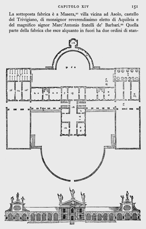 Palladio, siguiendo a Barbaro,incluyó el principio de disegnoen el análisis que hizo de la reflexión vitruviana de la formaen términos de lo inteligible y lo sensible en conexión con la tríada de firmitas, utilitas y venustas.19Ahí, Palladio escribió que sólo se puede considerar perfecta la forma si se toma en cuenta cada una de las partes del edificio en el disegno y la maqueta y, a la vez, en la misma línea de Vitruvio, advirtió que el arquitecto tiene claro, con los dibujos de la planta y el alzado, cómo va a resultar la forma y su interior respecto a la tríada vitruviana que tradujo al volgare con los términos fermezza, utilità y bellezza: