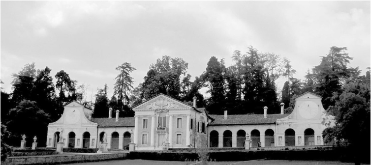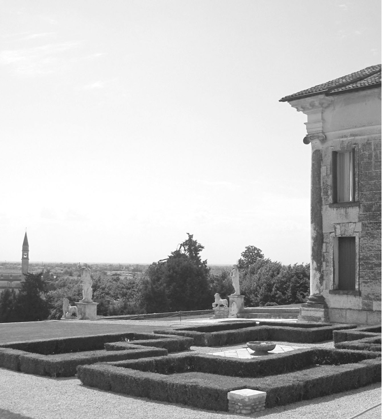 La relación naturaleza-arquitectura en la teoría y praxis de la Antigüedad que trascendió al pensamiento renacentista es particularmente notable en las villas palladianas. Palladio dejó constancia sobre la aplicación de este conocimiento en I Quattro libri, donde incluyó los dibujos de sus villas en proyección ortogonal como modelos visuales con las descripciones que hizo de éstas. Así, enfatizó las cualidades de diseño que le interesó resaltar revelando la dialéctica entre la naturaleza y la villa: la topografía y belleza del lugar; la especificidad del paisaje en que se inserta haciendo hincapié no sólo en la importancia de la variedad de los puntos de vista hacia el espacio natural en el diseño, sino también el diálogo con el paisaje y su integración con el territorio agrícola véneto y, a su vez, la transformación formal de éste gracias al análisis tipológico de la villa;45 la articulación entre los diversos espacios de la villa; los accesos, los recorridos internos y externos; la integración del jardín en el complejo; los frescos de los salones; incluso habló del sistema hidráulico.46